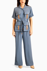 A luxury crepe two piece set with oversized pockets, front-tie and brown tape detailing on top and pants.