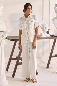 A luxury crepe two piece set with oversized pockets, chain detailing and a front tie buckle.