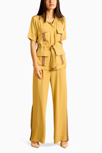 A luxury crepe two piece set with oversized pockets, front-tie and brown tape detailing on top and pants.