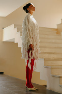 Featuring the Ripple Ruffle White Shirt Dress by Trisara's Fuss Over Me Collection. Crafted in white royal georgette, this straight-fit dress features delicate ruffle detailing, offering a fresh, feminine twist on the classic shirt dress silhouette.