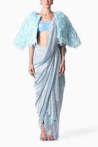 The Feather Jacket has an open-front silhouette cut in a light satin covered completely with faux feathers. Pair it with our shimmer Galaxy Sari and make a statement this season. This jacket works as a perfect layer on days when its not too cold. Pair it with our embroidered Riri Blouse.