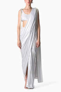 Our bestselling draped sari now in our new slinky jersey that literally feels like liquid. The Waterfall Sari is lightweight, crush free and easy to wear. All you need to do is button up the waist, throw the pallu over your shoulder and you are good to go. Elevate the Waterfall Sari with the detachable Pearl Pallu that can be hooked on to your other saris as well as over a classic white shirt. Pair it with the RiRi blouse that is hand embroidered with transparent sequins. It has a square neckline and closes on the side with a zipper. Perfect outfit for those fun boho day weddings.