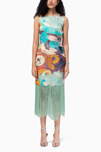 A fitted midi dress with a scalloped hem. Added scalloped fringe stitched to the hem for extra drama.