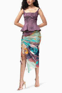 A well constructed peplum top with a contrast stitch detail paired with an asymmetrical, fitted ruched skirt. Shell tassels added at the skirt. Please note, as these shells are delicate, rough use may cause them to break. In case they do, please feel free to reach out to us as we would be more than happy to stitch them back in for you!