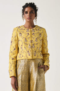 The Rizwana Nargis Silk Jacket is a contemporary must-have layer for winter weddings. The pure silk surface is decorated with the most beautiful floral jaal in musuem quality heritage hand embroidery in dabka and zardozi. Length of crop jacket - 19"