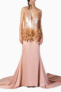 Featuring the Ro Baby Pink Jacket With Anaya Peach Skirt, a meticulously hand-embroidered sleeveless piece adorned with sequins. Tailored for a flattering fit, it features a flared peplum from the waist with sequin tassel details, a thin round collar, deep neckline, and fastens at the front with a button and loop closure. Paired with the Anaya Peach Skirt, crafted from soft, luxurious crepe that drapes beautifully around the body, featuring a long trail at the back and a side zip closure. This co-ord set offers timeless elegance and a complete, sophisticated look perfect for layering over a sari or skirt.