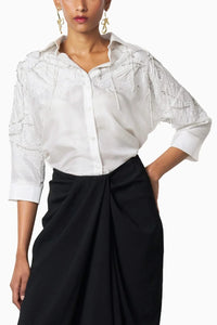 The Ro Shirt is a timeless piece featuring a relaxed fit and 3/4 sleeves. Adorned with white machine embroidery on the front, back, and sleeves, it’s beautifully enhanced with hand-embroidered pearls, cutdana, and rhinestones, adding a subtle hint of glam and refined detail.