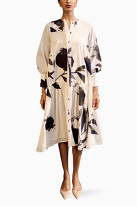 Featuring an off white mul drop waist tent dress with an invisible placket, flounced bottom tier and full sleeves.