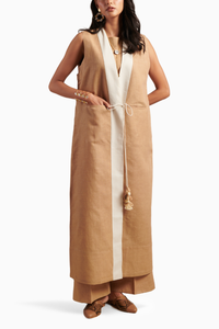 Arrive in time for a fashionably late high tea or maybe even an opera on an evening, you’ll fit right in with our Rooh Co-ord Set yet strikingly stand out. With the most minimal detailing like a tassel tie-up and contrasting front panel on the overlay and a super easy trouser, there’s an innate multiplicity in its persona that delivers high style impact, making it easy to move from event to the other and from one look to another. ÂÂ
