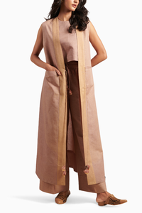 Arrive in time for a fashionably late high tea or maybe even an opera on an evening, you’ll fit right in with our Rooh Co-ord Set yet strikingly stand out. With the most minimal detailing like a tassel tie-up and contrasting front panel on the overlay and a super easy trouser, there’s an innate multiplicity in its persona that delivers high style impact, making it easy to move from event to the other and from one look to another. ÂÂ