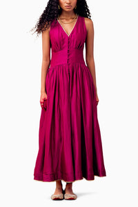 This Jamun pink button-down dress, crafted from Chanderi silk, features elegant bijiya gota detailing at the neckline and hemline. The gown is fully lined for a refined fit, with a flattering V neckline and practical side seam pockets. It is designed with a hook-and-eye opening at the front, blending sophisticated style with functional details.
