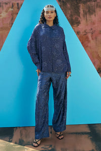 Our Roop Pants are designed using hand block printed silk fabric. It features surface embellishments, a concealed hook and zip side closure, side pockets, a soft muslin inner lining, and has a high waist relaxed fit. It pairs well with our embellished tops and makes for an apt festive pick.