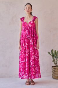 Embrace effortless elegance in the Rosa Aurelia dress, a breezy statement piece crafted in feather-light chiffon. Featuring soft ruffle straps, a sweetheart neckline, and a flared tiered silhouette, this dress blooms in fuchsia pink with abstract floral motifs. Ideal for spring and summer soirées, it flows with grace and charm for both daytime strolls and evening get-togethers.