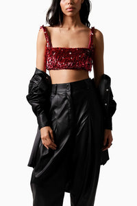 The Rosa Blouse is cut with a deep square neckline and thin straps. It is hand embroidered with metallic sequins and shells and closes on the side with a zipper. Pair it with our draped saris or also use it as a cropped top with skirts or pants.