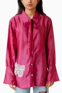 Featuring Rosa Pink Mia Shirt by URAIB from The Colored Castle Collection. Tailored from Chanderi fabric, this shirt boasts a bold and stylish look with its captivating hand embroidered butterfly, ensuring a distinctive wardrobe essential.