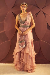 Dusty rose ruffled pre-drape georgette and organza sari with embroidered highlighted cut sleeves velvet blouse, a waist belt highlighted with zari, dabka and thread work.