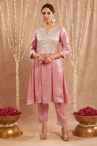 The Blushing Rose Yoke Tissue Anarkali with Narrow Pants is a chic two-piece set. The kurta, made from luxurious tissue fabric, features decorative laces for an elegant touch. Paired with narrow pants, also crafted in tissue fabric and embellished with gota laces, this set offers a perfect blend of comfort and style.