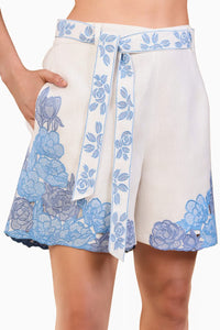 Rosebud Shorts: a symbol of summer sophistication and comfort. Crafted from soft, pure linen, these shorts feature intricate hand embroidery and detailed cutwork for an elegant touch. Complete with an embroidered belt, a stylish ensemble to keep you cool and chic throughout the season.