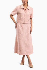 A soft blush pink textured tweed set featuring a cropped short-sleeve jacket with gold-tone buttons and patch pockets, paired with an A-line midi skirt. Subtle floral embellishments enhance its elegant, feminine charm—perfect for day events, brunches, business casual, or semi-formal gatherings.