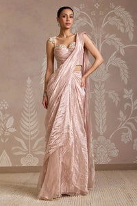 Featuring Rose Gold Corset Hem Sari Set by Ridhi Mehra's In the Folds Summer Collection '25. This luxurious set includes a tissue draped and embroidered corset, paired with a tissue stitched ruffled saree for a blend of modern sophistication and classic charm. The rose gold tone adds a timeless elegance to any occasion.