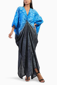 Introducing the Black and Blue Ombre Shibori Silk Kaftan, a stunning addition to your festive wardrobe. This gorgeous kaftan features a striking v-neck design and a central front detail that enhances its sophisticated silhouette. The rich ombre effect of black and red adds a touch of elegance and drama, making it perfect for any special occasion. Crafted from luxurious silk, this kaftan combines comfort with high fashion, ensuring you look and feel extraordinary at your next event.