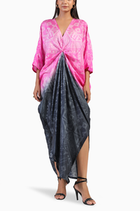 Introducing the Black and Pink Ombre Shibori Silk Kaftan, a stunning addition to your festive wardrobe. This gorgeous kaftan features a striking v-neck design and a central front detail that enhances its sophisticated silhouette. The rich ombre effect of black and red adds a touch of elegance and drama, making it perfect for any special occasion. Crafted from luxurious silk, this kaftan combines comfort with high fashion, ensuring you look and feel extraordinary at your next event.