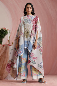 The Rose Mahal Cape is crafted from luxurious poly satin in ivory, adorned with delicate floral motifs and subtle powder blue accents. Its soft sheen enhances the graceful drape, while a detailed border adds structure. Perfect for both traditional and modern outfits, it blends timeless charm with artistry.