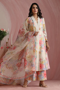 The Rose Mahal Side Gathered Kurta Set blends organza’s lightness with chanderi’s sheen. Featuring a side-gathered silhouette and delicate embroidered lace, the ivory kurta offers elegant movement. Paired with chanderi bottoms and an organza dupatta, it’s perfect for festive events or refined everyday wear.