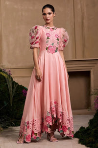 This rose pink Chanderi flounce dress is a stunning blend of artistry and elegance. Adorned with intricate 3D floral appliqué, delicate threadwork, beadwork, and cutwork, it showcases a rich texture and dimensionality. The flounce detail adds a playful yet sophisticated flair, while the yoke detail enhances the dress’s structured silhouette.