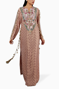 Featuring Rose Pink Dash Ikat Banarasi Georgette Embroidered Yoke Kaftan With Organza Detailed Sleeves