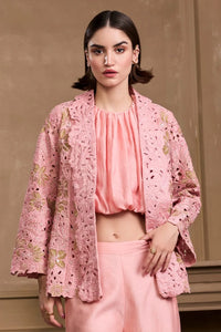 Rose Pink Metallic Applique And Cutwork Flared Jacket