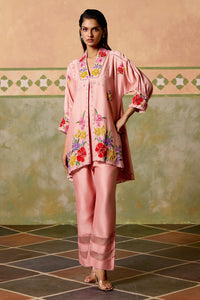 Featuring a rose pink chanderi kimono tunic adorned with chain-stitch threadwork and beadwork, paired with rose pink chanderi pants accented with elegant sheer detailing.