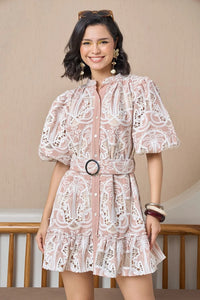 A dreamy blend of blush and ivory, this dress features intricate lacework, voluminous puff sleeves, and a ruffled hem. With its belted waist and button-down front, it offers a flattering silhouette—perfect for resort days or chic soirées.