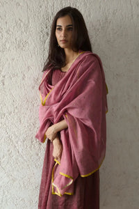 The Rose Shimmer Dot Odhani is a delicate sheer shimmer scarf adorned with a silk potla potli trim. Its soft, elegant design adds a touch of sophistication and charm, perfect for enhancing any ensemble with a subtle, graceful flair.