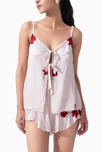 The Rose Sorbet Printed Camisole Set blends elegance and comfort with its softest modal fabric and romantic rose print. Featuring a camisole with bow-tie buttons and matching ruffle printed shorts, this sleepwear Set is perfect for lounging and sleeping in style. Add a sweet, romantic vibe to your evenings with this chic nightwear ensemble, ideal for cozy nights or relaxed mornings.