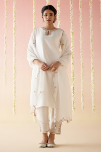Fabric- Kurta: Chanderi, Pant: Chanderi, Dupatta: Viscose Organza Color- Rose White Components- 3 Product Code- SVENEROGMKSD24