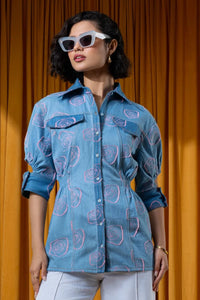 A timeless denim blouse with a chic touch, adorned with intricately embroidered rose patches all over. A perfect blend of elegance and casual charm for effortless styling.