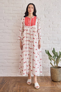 Effortlessly romantic and full of springtime charm, this relaxed-fit dress is crafted in airy, handwoven cotton with delicate jamdani-style woven floral motifs and polka dots in poppy red. The highlight of the piece is its deep red panelled yoke in a textured grid weave, framed by a keyhole neckline and tie-up detail finished with handmade thread tassels. The gathered waistline below the yoke creates a graceful, voluminous fall, while the full sleeves add to its breezy, bohemian appeal. Designed to offer comfort with elegance, this dress is perfect for warm-weather brunches, garden soirees, or slow weekend getaways. Pair it with slip-ons or leather flats for an easy-chic look.