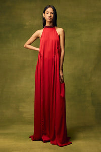 A floor-length halter-neck gown in a bold red hue, featuring a fluid silhouette with soft gathers cascading from the neckline. The look is elevated with an embroidered neckline detail, adding structure to the otherwise free-flowing drape.