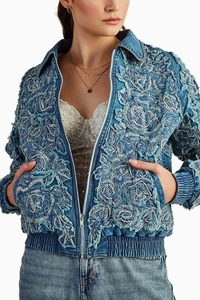 Featuring the Roses Denim Jacket by Roseroom, this denim bomber jacket boasts a unique quilted rose pattern, providing a distinct surface texture. Crafted from premium denim in a blue hue, its intricate details offer a truly unique and stylish look.