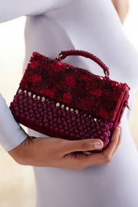 Featuring the Roses In December Bag by The Right Sided. This Bag captures timeless elegance with its short-haired velvet (vegan) in rich hues of ruby. Perfect for evening affairs and cocktail parties, this exquisite handbag adds a touch of opulence and sophistication to any outfit.