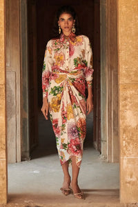 The shirt features a classic straight fit adorned with exquisite hand embroidery on collar and cuffs. The back yoke is highlighted with contrast thread work. The ensemble comes with sarong skirt which can be tied up in multiple ways. Corners of tie-up is embellished with hand detailing.
