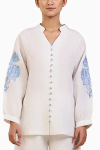 Rosette Shirt: an essential addition for summer elegance. Meticulously crafted from pure, soft linen, this graceful white shirt features delicate hand-embroidered buttons and loops, radiating timeless charm. Enhanced by intricately embroidered sleeves, it embodies the perfect fusion of sophistication and style, suitable for any occasion.
