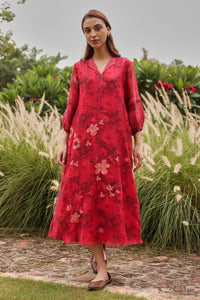 The Rosewood Bloom Embroidered Dress features a flowy silhouette with delicate floral prints, complemented by a striped textured collar and gathered cuffs. Its graceful design and subtle detailing make it perfect for festive occasions and beyond.