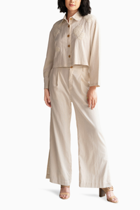 Elevate your style with this stunning co-ord set, featuring intricate rose lace patchwork that adds a touch of elegance and sophistication. The classic wooden buttons on the front placket and sleeves lend a timeless charm, while the straight-fit pants with a side slit at the hemline ensure both comfort and a chic silhouette. This ensemble is perfect for making a memorable statement, seamlessly blending classic details with contemporary flair.