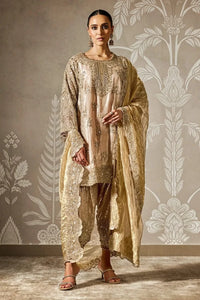 The Roshni Kurta Set dazzles with an allover embroidered tissue kurta and intricately embroidered tissue salwar. Paired with a tissue dupatta adorned by a four-sided embroidered border, this ensemble is a sublime fusion of delicate artistry and elegant silhouettes, perfect for the modern aficionado of refined style.
