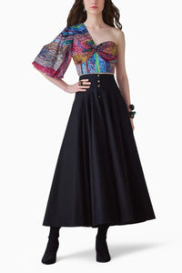 Featuring Rosie Block Print Blouse & Ria High-Waist Skirt by Saaksha & Kinni, this chic set includes a block print-inspired one-shoulder blouse with part hand micro pleating, a balloon sleeve, and knot detailing. Paired with a high-waist flared skirt featuring a center button closure for a stylish, elegant look.