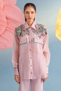 In a soft lilac hue, the Rosie Shirt set features a sheer silk organza shirt paired with an imported crepe inner. Intricately adorned with dori work, pearls, and 3D floral embroidery, it radiates a quiet elegance and refined charm. A delicate yet statement-making piece, ideal for intimate gatherings and elegant occasions.