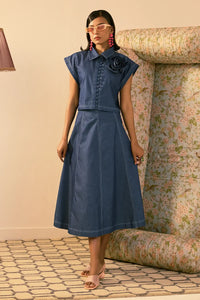 A chic, matching two-piece set in a deep, saturated blue. The outfit is defined by the floral appliqué on the fitted, button-up top and the clean, flared volume of the midi-length skirt. It’s a polished, modern take on vintage resort wear.