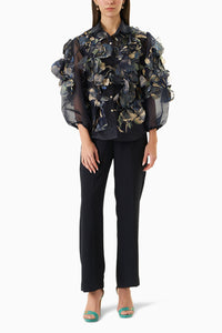 This elegant blue organza brasso set features exquisite 3D embroidery, paired with sleek straight pants in twill georgette for a refined, sophisticated look. A stunning combination of texture and style, perfect for any special occasion.